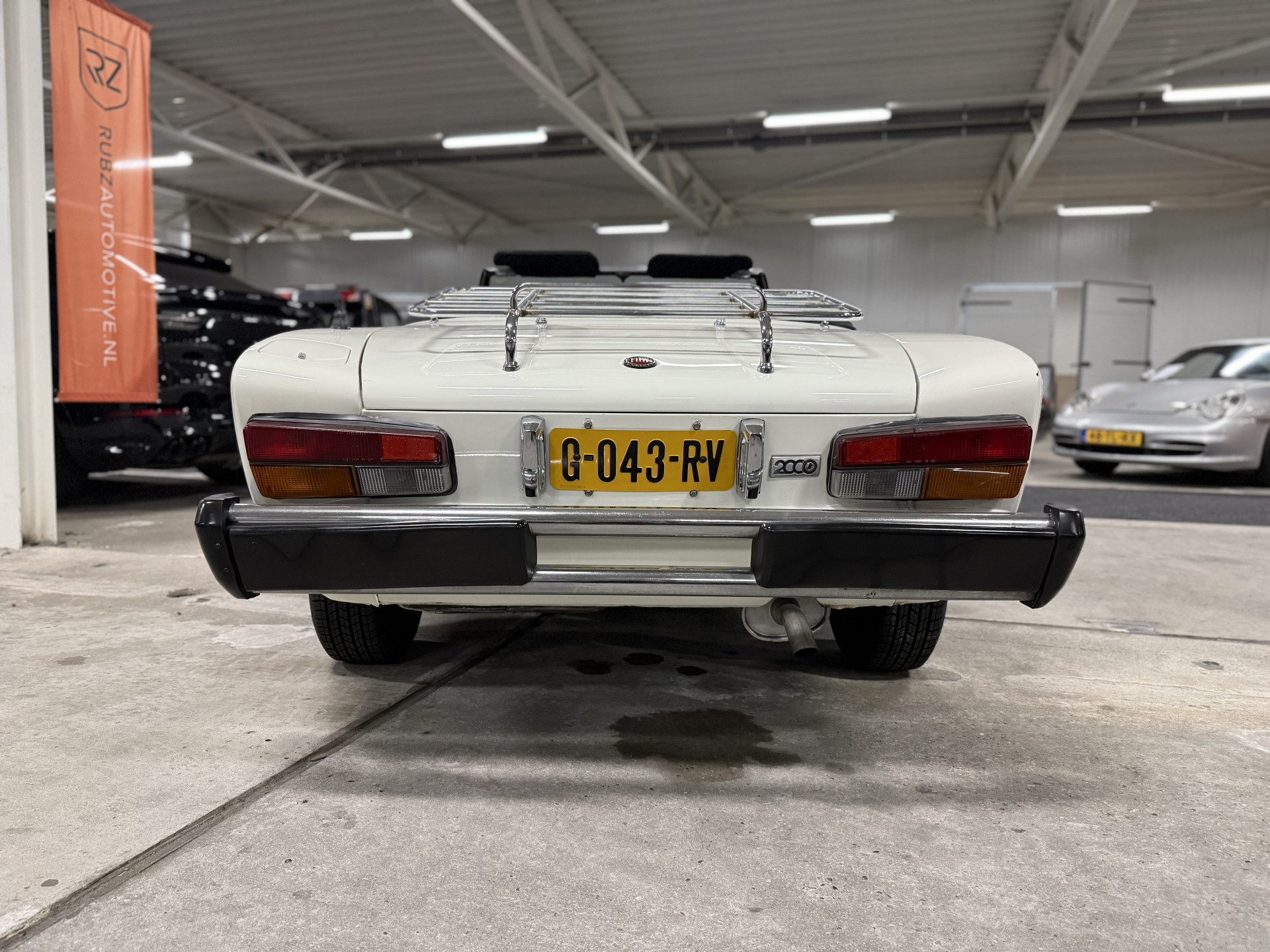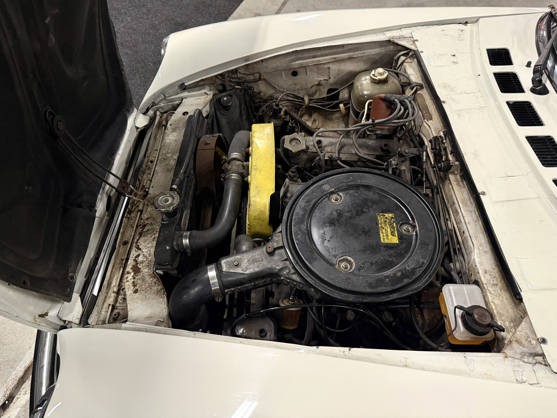 This model was highly innovative for its time: this generation features disc brakes all around, a sporty 5-speed gearbox, independent suspension, and Bosch L-Jetronic injection (instead of carburetors). The rubber bumpers were mandatory (5 mph impact rule). To compete with MG and Triumph, they came standard with rich leather upholstery, adjustable seats, an FM radio, speakers, and a wooden gear lever. A rack was also installed on the tailgate, suitable for a suitcase. Road tax is waived, and the insurance premium is very reasonable, considering this car is over 40 years old. The exterior color of this Spider is called "Bianco Ghiaccio": a bright, cool white with a subtle, light grayish undertone.