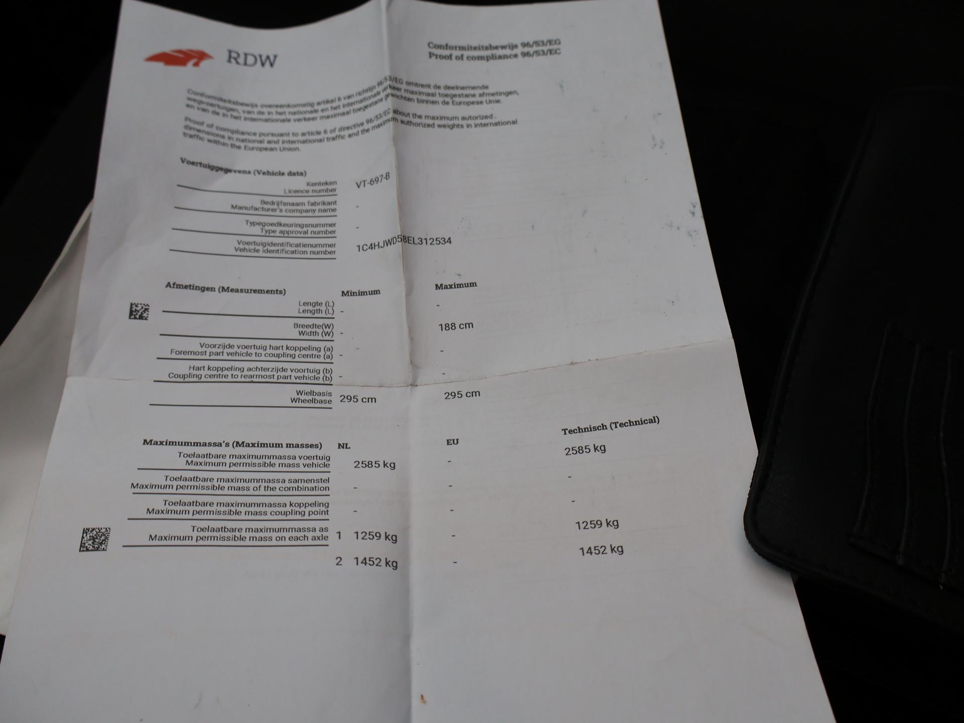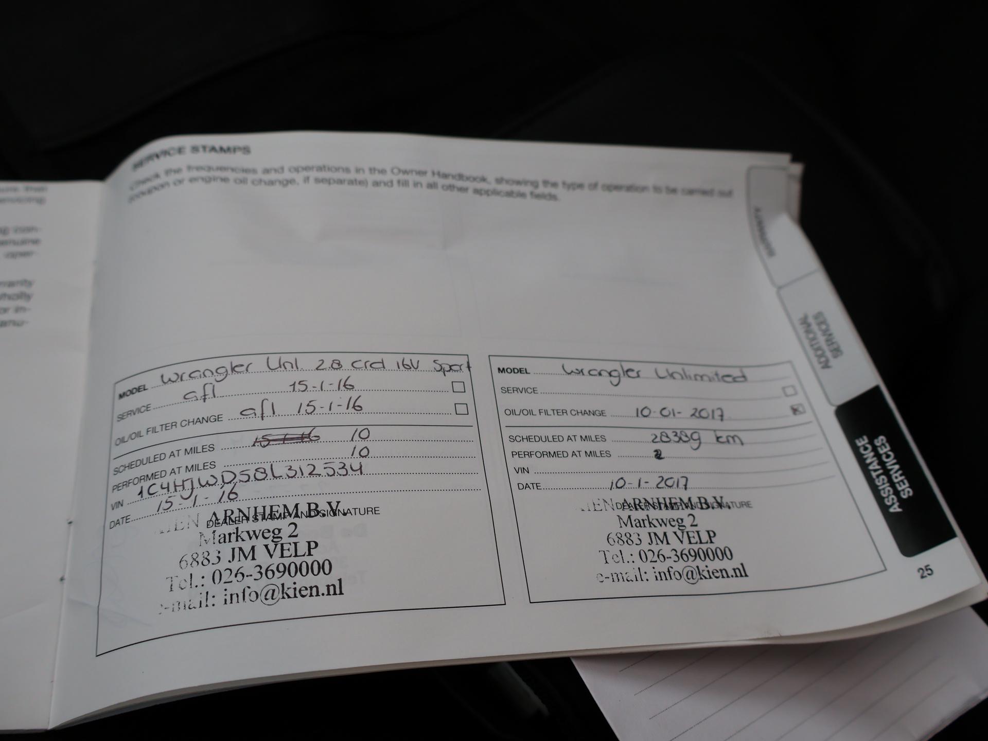 Origineel Nederlandse Jeep Wrangler 2.8 CRD 200 PK Sport 4X4 Automaat, Grijs kenteken met 2 zitplaatsen, Afneembaar dak in 2 delen waardoor je dus ook met het dak open kunt rijden, Trekhaak met 2200 KG trekgewicht, All terrain banden met goed profiel, Lichtmetalen velgen, Airco, Cruise control, Elektrische ramen, Prijs is exclusief BTW. Meer informatieAlgemene informatieMerk: JeepModel: Wrangler Type: 2.8 CRD 200 PK SPORT AUT. 4X4 GRIJS KENTEKEN Modelreeks: 2011 - 2018 Technische informatieKoppel: 460 NmAandrijving: Vierwielaandrijving Tankinhoud: 79 liter Acceleratie (0-100): 10,7 s Topsnelheid: 172 km/u MatenBreedte: 188 cmWielbasis: 295 cm GewichtenLedig gewicht: 2.160 kgLaadvermogen: 425 kg Max. trekgewicht: 2.090 kg (ongeremd 750 kg) MilieuCO₂-uitstoot (NEDC): 230 g/kmFinanciële informatieMotorrijtuigenbelasting: € 196 per kwartaalBeschikbare afleverpakketten:[list][*]Basispakket (inbegrepen):Vloeistofcheck Kenteken tenaamstelling Schoonmaken [*]Servicepakket 1 (€ 495 meerprijs): Olie servicebeurt incl. filter Schoonmaken Dit afleverpakket bevat (in plaats van afleverpakket "Basispakket"): Hazet garantie 3 maanden (3 maanden garantie); Nieuwe APK[/list] ProductveiligheidEU verantwoordelijke: FCA Netherlands BV Lemelerbergweg 12 1101 AJ Amsterdam, NL customercare.holland@fcagroup.com |