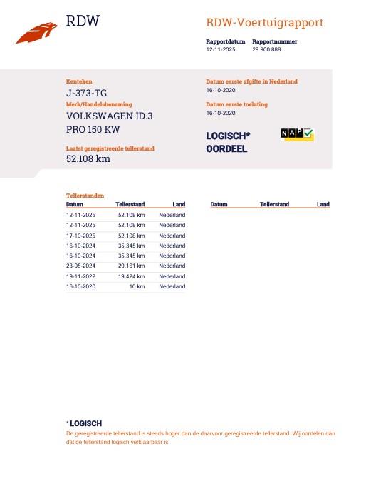 Algemene informatieMerk: VolkswagenModel: ID.3 Type: First Plus 58 kWh | Apple Carplay | Android Auto | Trehaak | Camera| Navigatie | AandrijvingActieradius: 424 kmAsconfiguratieAandrijving: AchterwielaandrijvingBandenmaat: 215/55 R18 PrestatiesAcceleratie (0-100): 7,3 sTopsnelheid: 160 km/u Maten en gewichtenLedig gewicht: 1.694 kgLaadvermogen: 566 kg Afmetingen (LxBxH): 426 x 181 x 157 cm Wielbasis: 277 cm AccuAccu: 58 kWhAccu laden: Type 2, 3-fasen, 11 kW, 84 km actieradius per uur, compleet vol in 16 uur en 6 minuten Accu snelladen: Combined Charging System, 477 km actieradius per uur, compleet vol in 2 uur en 38 minuten VerbruikGemiddeld elektriciteitsverbruik: 13,679245283019 kWh/100kmOnderhoud, historie en staat100% Onderhouden: Ja (kwaliteitslabel aanwezig)Aantal sleutels: 2 (1 handzender) Financiële informatieMotorrijtuigenbelasting: € 73 - € 81 per kwartaalBeschikbare afleverpakketten:[list][*]Basis service pakket: (inbegrepen): Het basis service pakket omvat: aflevering van de door u aangeschafte occasion inclusief een geldige APK , een algehele inspectie, vloeistoffen afvullen en coulance bij onvoorziene defecten gedurende 3 maanden na aanschaf.[*]Borgauto 3 maanden pakket (voertuigen 950 kg > ) (€ 495 meerprijs): Dit aflever pakket omvat: aflevering van de door u aangeschafte occasion inclusief een nieuwe APK, 3 maanden garantie, een algehele inspectie en een onderhoudsbeurt volgens onderhoudsschema.Dit afleverpakket bevat (in plaats van afleverpakket "Basis service pakket:"): BOVAG garantie (3 maanden)[*]Borgauto 6 maanden pakket (voertuigen 950 kg >) (€ 795 meerprijs): Dit aflever pakket omvat: aflevering van de door u aangeschafte occasion inclusief een nieuwe APK, 6 maanden garantie, een algehele inspectie en een onderhoudsbeurt volgens onderhoudsschema. Dit afleverpakket bevat (in plaats van afleverpakket "Basis service pakket:"): BOVAG garantie (6 maanden)[*]Bovag garantie 12 maanden garantie pakket (voertuigen 950 kg >) (€ 995 meerprijs): Dit aflever pakket omvat: aflevering van de door u aangeschafte occasion inclusief een nieuwe APK, 12 maanden Bovag garantie, een algehele inspectie, onderhoudsbeurt volgens onderhoudsschema en tenaamstelling van het voertuig. Dit afleverpakket bevat (in plaats van afleverpakket "Basis service pakket:"): BOVAG garantie (12 maanden)[/list] Overige informatieEmissie: Zero emissie |