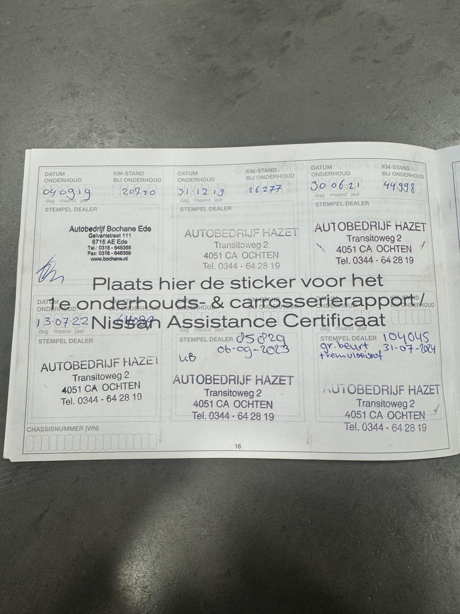 Origineel Nederlandse Nissan Qashqai van 12-2018, 1.2 N-Connecta uitvoering, Handgeschakeld met 6 versnellingen, In 2019 door ons verkocht en sinds die tijd altijd bij ons in onderhoud geweest, Trekhaak, Panorama-dak, 18 Inch lichtmetalen velgen, 360 Graden camera, Lane-assist, Cruise control, Climate control, Navigatiesysteem met kaartweergave, Bluetooth telefoonverbinding met audiostreaming, Elektrisch inklapbare buitenspiegels. Meer informatieAlgemene informatieMerk: NissanModel: Qashqai Type: 1.2 N-CONNECTA + TREKHAAK | PANORAMA | 18 INCH Modelreeks: 2017 - 2021 Technische informatieKoppel: 190 NmAandrijving: Voorwielaandrijving Tankinhoud: 55 liter Acceleratie (0-100): 10,6 s Topsnelheid: 185 km/u MatenAfmetingen (LxB): 439 x 181 cmWielbasis: 265 cm GewichtenLedig gewicht: 1.250 kgLaadvermogen: 610 kg Max. trekgewicht: 1.200 kg (ongeremd 674 kg) MilieuCO₂-uitstoot (NEDC): 129 g/kmFinanciële informatieMotorrijtuigenbelasting: € 172 - € 188 per kwartaalBeschikbare afleverpakketten:[list][*]Basispakket (inbegrepen):Vloeistofcheck Kenteken tenaamstelling Schoonmaken [*]Servicepakket 1 (€ 495 meerprijs): Olie servicebeurt incl. filter Schoonmaken Dit afleverpakket bevat (in plaats van afleverpakket "Basispakket"): Hazet garantie 3 maanden (3 maanden garantie); Nieuwe APK[*]Servicepakket 2 (€ 695 meerprijs): Onderhoudsbeurt volgens schema Schoonmaken Dit afleverpakket bevat (in plaats van afleverpakket "Basispakket"): Hazet garantie 6 maanden (6 maanden garantie, 10.000 km garantie); Nieuwe APK[*]Servicepakket 3 (€ 995 meerprijs): Onderhoudsbeurt volgens schema Poetsen, polijsten en interieur reiniging Dit afleverpakket bevat (in plaats van afleverpakket "Basispakket"): BOVAG garantie (12 maanden); Nieuwe APK[/list] ProductveiligheidEU verantwoordelijke: Nissan Nederland BV Herikerbergweg 214 1101 CM Amsterdam, NL 08000231513 www.nissan.nl netherlands@nissan-services.eu |