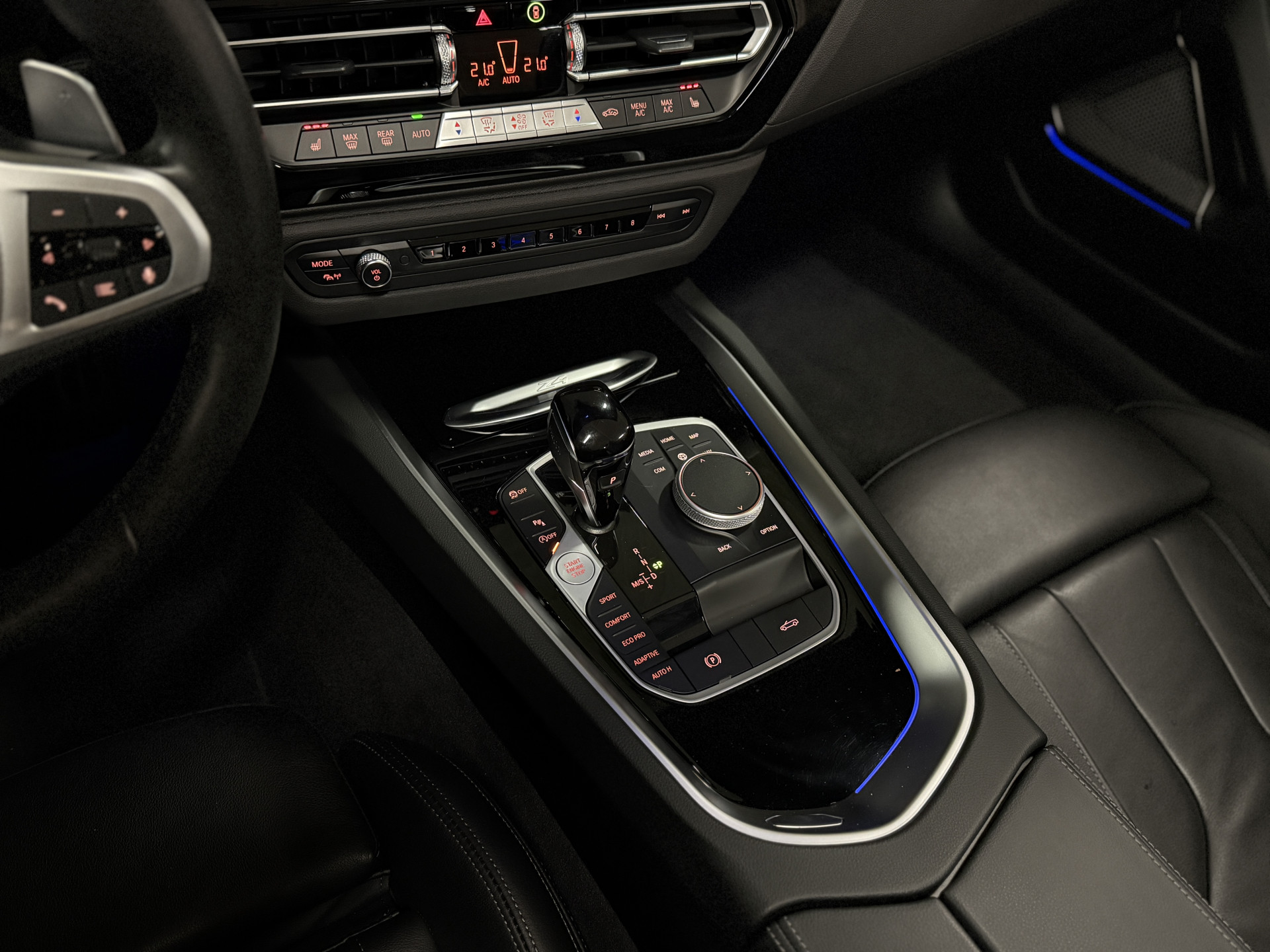 Het tijdloze, gedrongen design kan jong en oud bekoren. Sportieve elementen uit het M-Aerodynamica pakket, zoals de hoogglans zwarte sierlijsten [uit het Shadow Line-pakket] en rode M-Sport remklauwen achter de zwarte breedset 19-inch Styling 799M-wielen onderstrepen het charismatische karakter van het Saffierzwart metallic. Naast veel leder met contrasterende grijze bies treffen we in het interieur hoogglans zwarte dashboard-inleg, een Harman/Kardon Surround Sound-systeem en een dik M-Sport stuurwiel met bediening, verwarming én flippers voor de 8-traps sportautomaat. Zitcomfort wordt geboden door sportstoelen met elektrische verstelling met memory, lendensteun én verwarming.