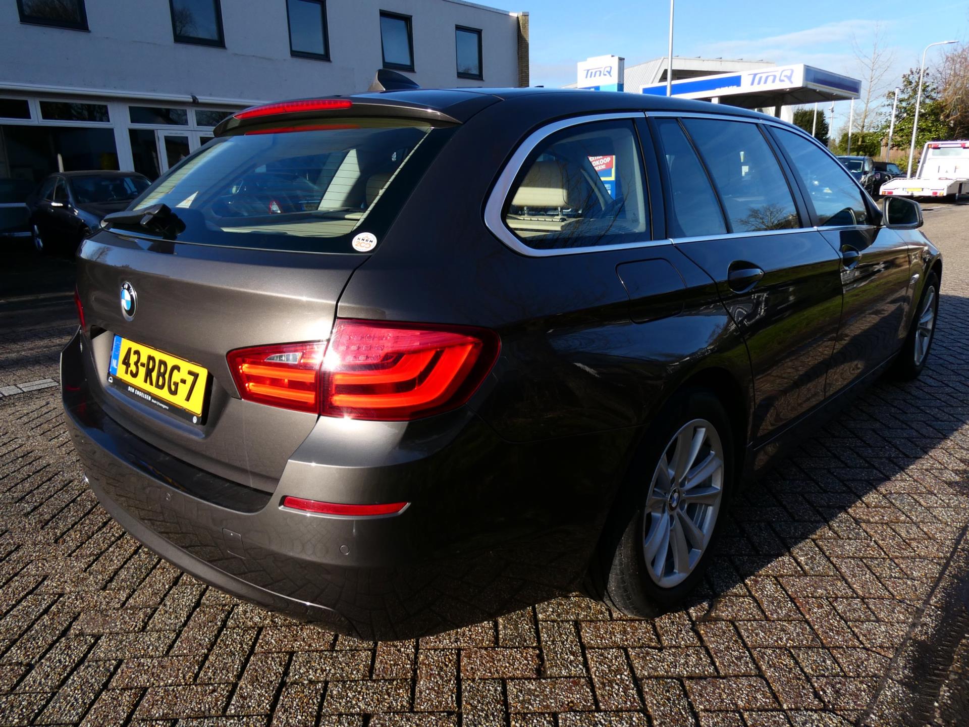 Maak kennis met deze uiterst complete BMW 5-serie Touring 523i High Executive. Een luxe allround stationwagen waar stijl en comfort samenkomen. Uitgevoerd in de chique kleur 'bruin', met een fraai afgewerkt interieur met luxe lederen bekleding en details in houtafwerking. Onder de motorkap schuilt een krachtige 3.0L zescilinder motor met 150 kW (204 pk), gekoppeld aan een soepele 8-traps automatische transmissie. Perfect voor lange reizen dankzij een topsnelheid van 227 km/u en een gemiddeld brandstofverbruik van slechts 7,8 liter per 100 km.