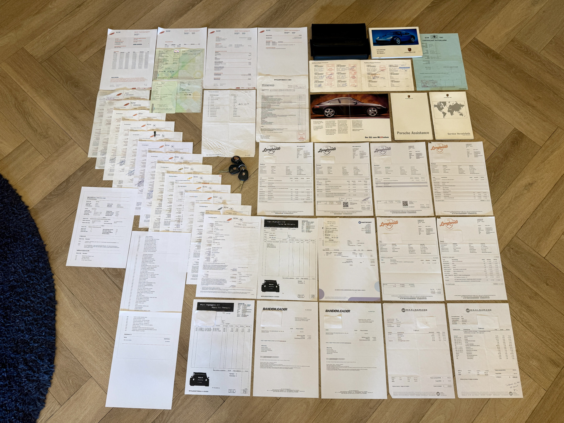 De afgelopen jaren werd onderhoud uitgevoerd door specialist Longhoods, het laatste reguliere onderhoud met versnellingsbakolie, remvloeistof en een draagarm bij 247.751km [4-7-2022]. In 2021 zijn de banden [Michelin Pilot Sport 2 met N-codering] rondom, airco-condensors en radiateurs vervangen. De elektronica functioneert naar behoren en de boordcomputer is storingsvrij. De motor klinkt, ook bij een koude start, zijdezacht [zonder rook-ontwikkeling] en de versnellingsbak schakelt probleemloos. Er is niets bekend over veelbesproken modificaties [IMS en AOS]. Onder het kopje 'documenten' op onze website treft u gedetailleerde foto's van de aanwezige documentatie. Na binnenkomst hebben wij de auto professioneel laten poetsen en de wielnaven en -bouten gespoten. De Porsche wordt geleverd met twee sleutels, documentatie met originele kentekenbewijzen, APK-rapporten, facturen, originele Millennium-folder en boekjes en een onderhoudsbeurt conform interval. De APK geldt tot 22 januari 2027. Een onafhankelijke aankoopkeuring is altijd mogelijk.