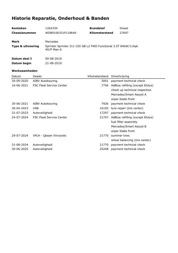 Noem eens een Duits B-merk? Kennen ze niet. Uitstekende auto′s, al vele decennia lang. Dat geldt ook voor deze. Op de teller van deze auto staat slechts 27.697 kilometer. De aandrijving komt voor rekening van een dieselmotor en een Handgeschakelde versnellingsbak. De lekker grote deuropening van de schuifdeur aan passagierszijde zorgt voor een heerlijk ruime instap. De uitmonstering van deze auto wordt gecompleteerd door onder elektrisch bedienbare en verwarmde buitenspiegels. Meer informatieAlgemene informatieMerk: Mercedes-BenzModel: Sprinter Type: 311 CDI GB L2 FWD Functional 3.5T Modeljaar: 2019 Modelcode: - Technische informatieKoppel: 300 NmAandrijving: Voorwielaandrijving Tankinhoud: 65 liter Topsnelheid: 120 km/u MatenAfmetingen (LxBxH): 593 x 199 x 236 cmWielbasis: 392 cm GewichtenLedig gewicht: 2.050 kgLaadvermogen: 1.450 kg Max. trekgewicht: 2.000 kg (ongeremd 750 kg) FunctioneelAfmetingen laadruimte: 327 x 178 cmInhoud laadruimte: 9.500 l StaatTechnische staat: goedOptische staat: goed Staat interieur: goed Aantal sleutels: 2 (2 handzenders) Financiële informatieMotorrijtuigenbelasting: € 183 per kwartaalAfleverpakkettenInbegrepen afleverpakket: BasispakketDit afleverpakket bevat: Geldige APK, RDW-leges Overige informatieAirconditioning: werktStoringsmelding: Nee |