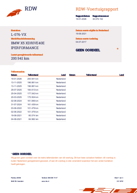 Disclaimer. Hoewel aan de informatie van deze website de grootst mogelijke zorg wordt besteed, kunnen wij niet aansprakelijk worden gesteld voor eventuele onjuiste informatie van welke aard dan ook. Is voor u een optie belangrijk, dan adviseren wij u hier specifiek naar te vragen. Meer informatieAlgemene informatieMerk: BMW Model: X5 Type: XDrive40e iPerformance High Executive, SOH/91%, 313 PK, Sportstoel, Head/Up, Navigatie/Prof., Driving/Assis. NIEUWE MOTOR!!AandrijvingPlug-in hybride: Ja Actieradius: 31 kmAsconfiguratieAandrijving: Vierwielaandrijving Bandenmaat voor: 275/40 R20 Bandenmaat achter: 315/35 R20PrestatiesAcceleratie (0-100): 6,8 s Topsnelheid: 210 km/uMatenAfmetingen (LxBxH): 489 x 194 x 176 cm Wielbasis: 293 cmGewichtenLedig gewicht: 2.205 kg Laadvermogen: 775 kg Max. trekgewicht: 2.700 kg (ongeremd 750 kg)AccuAccu: 9 kWh, Conditie: 100% Accu laden: Type 2, 1-fase, 3.7 kW, compleet vol in 2 uur en 48 minutenVerbruikGemiddeld elektriciteitsverbruik: 29,032258064516 kWh/100kmStaatSchade: schadevrij Aantal sleutels: 2 (2 handzenders)Financiële informatieMotorrijtuigenbelasting: € 441 - € 482 per kwartaal |