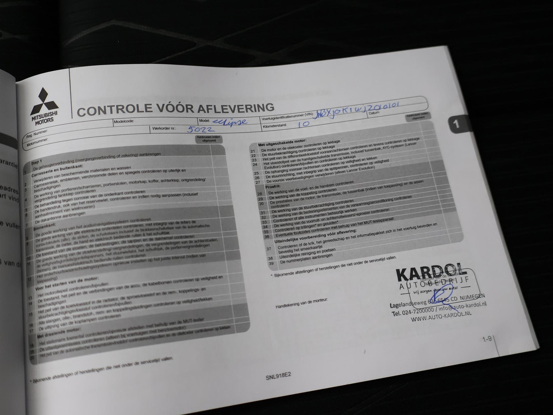 Origineel Nederlandse en 1e eigenaar auto, 1.5 Turbo 163 PK handgeschakeld in het New Bronze metallic, Luxe Intense uitvoering, Volledig Mitsubishi dealer onderhouden, Trekhaak met 1600 kg trekgewicht op kenteken, Achteruitrijcamera, 18 inch lichtmetalen velgen, Apple Carplay / Android Auto appstreaming Google Maps Navigatie, Flitsmeister, Spotify, Whatsapp etc, Privacy glass, Parkeersensoren voor en achter, DAB+ digitale radio. Meer informatieAlgemene informatieMerk: MitsubishiModel: Eclipse Cross Type: 1.5 DI-T 163 PK INTENSE + TREKHAAK Modelreeks: 2017 - 2021 Technische informatieKoppel: 250 NmAandrijving: Voorwielaandrijving Tankinhoud: 63 liter Acceleratie (0-100): 10,3 s Topsnelheid: 205 km/u MatenAfmetingen (LxB): 441 x 181 cmWielbasis: 267 cm GewichtenLedig gewicht: 1.400 kgLaadvermogen: 650 kg Max. trekgewicht: 1.600 kg (ongeremd 750 kg) MilieuCO₂-uitstoot (NEDC): 151 g/kmFijnstofuitstoot: 0,2 mg/km Financiële informatieMotorrijtuigenbelasting: € 226 - € 247 per kwartaalBeschikbare afleverpakketten:[list][*]Basispakket (inbegrepen):Vloeistofcheck Kenteken tenaamstelling Schoonmaken [*]Servicepakket 1 (€ 495 meerprijs): Olie servicebeurt incl. filter Schoonmaken Dit afleverpakket bevat (in plaats van afleverpakket "Basispakket"): Hazet garantie 3 maanden (3 maanden garantie); Nieuwe APK[*]Servicepakket 2 (€ 695 meerprijs): Onderhoudsbeurt volgens schema Schoonmaken Dit afleverpakket bevat (in plaats van afleverpakket "Basispakket"): Hazet garantie 6 maanden (6 maanden garantie, 10.000 km garantie); Nieuwe APK[*]Servicepakket 3 (€ 995 meerprijs): Onderhoudsbeurt volgens schema Poetsen, polijsten en interieur reiniging Dit afleverpakket bevat (in plaats van afleverpakket "Basispakket"): BOVAG garantie (12 maanden); Nieuwe APK[/list] ProductveiligheidEU verantwoordelijke: Mitsubishi Motor Sales B.V. Gondel 1 1186 MJ Amstelveen, NL 0204056800 www.mitsubishi-motors.nl info@mmsn.nl |