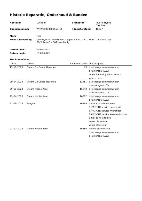 Meer informatieAlgemene informatieMerk: MiniModel: Mini Countryman Type: 1.5 Cooper S E ALL4 Essential Modelreeks: 2020 - 2024 Modelcode: F60 Technische informatieKoppel: 220 NmAandrijvingPlug-in hybride: JaTankinhoud: 36 liter Actieradius: 41 km AsconfiguratieAandrijving: VierwielaandrijvingPrestatiesAcceleratie (0-100): 6,8 sTopsnelheid: 196 km/u Maten en gewichtenLedig gewicht: 1.690 kgLaadvermogen: 580 kg Wielbasis: 267 cm AccuAccu: 10 kWhAccu laden: 3.7 kW Milieu en verbruikGemiddeld elektriciteitsverbruik: 13,4 kWh/100kmCO₂-uitstoot (WLTP): 41 g/km StaatTechnische staat: goedOptische staat: goed Staat interieur: goed Aantal sleutels: 2 (2 handzenders) Financiële informatieMotorrijtuigenbelasting: € 307 - € 335 per kwartaalAfleverpakkettenInbegrepen afleverpakket: BasispakketDit afleverpakket bevat: Geldige APK, RDW-leges ProductveiligheidEU verantwoordelijke: BMW Group Nederland Postbus 5805 2280 HV Rijswijk, NL 08000992234 www.mini.nl DSA-MINI@MINI.nlOverige informatieAirconditioning: werktStoringsmelding: Nee |