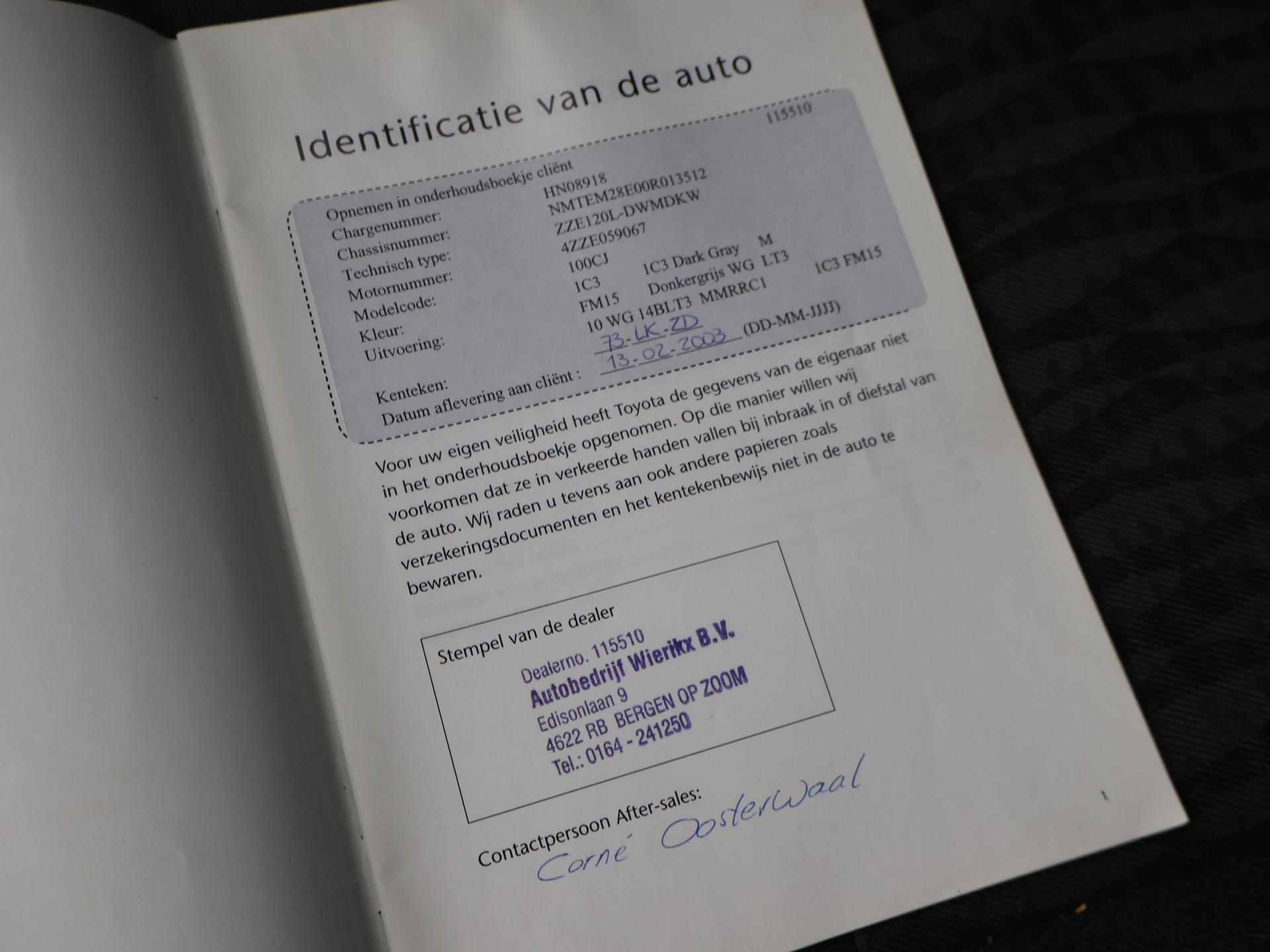 Origineel Nederlandse auto van 02-2003, 1.4 VVT-i Linea Terra, Comfortpakket met elektrische ramen en centrale vergrendeling, Trekhaak, Zo meeneemprijs. Meer informatieAlgemene informatieMerk: ToyotaModel: Corolla Wagon Type: 1.4 VVT-i LINEA TERRA + Modelreeks: 2002 - 2004 Technische informatieAandrijving: VoorwielaandrijvingAcceleratie (0-100): 12,0 s Topsnelheid: 185 km/u MatenWielbasis: 260 cmGewichtenLedig gewicht: 1.140 kgLaadvermogen: 515 kg Max. trekgewicht: 1.000 kg (ongeremd 450 kg) MilieuCO₂-uitstoot (NEDC): 160 g/kmFinanciële informatieMotorrijtuigenbelasting: € 145 - € 158 per kwartaalAfleverpakkettenInbegrepen afleverpakket: Basispakket:Vloeistofcheck Kenteken tenaamstelling Schoonmaken ProductveiligheidEU verantwoordelijke: Toyota Nederland Postbus 212 4940 AE Raamsdonksveer, NL 08000369 www.toyota.nl info@toyota.nl |
