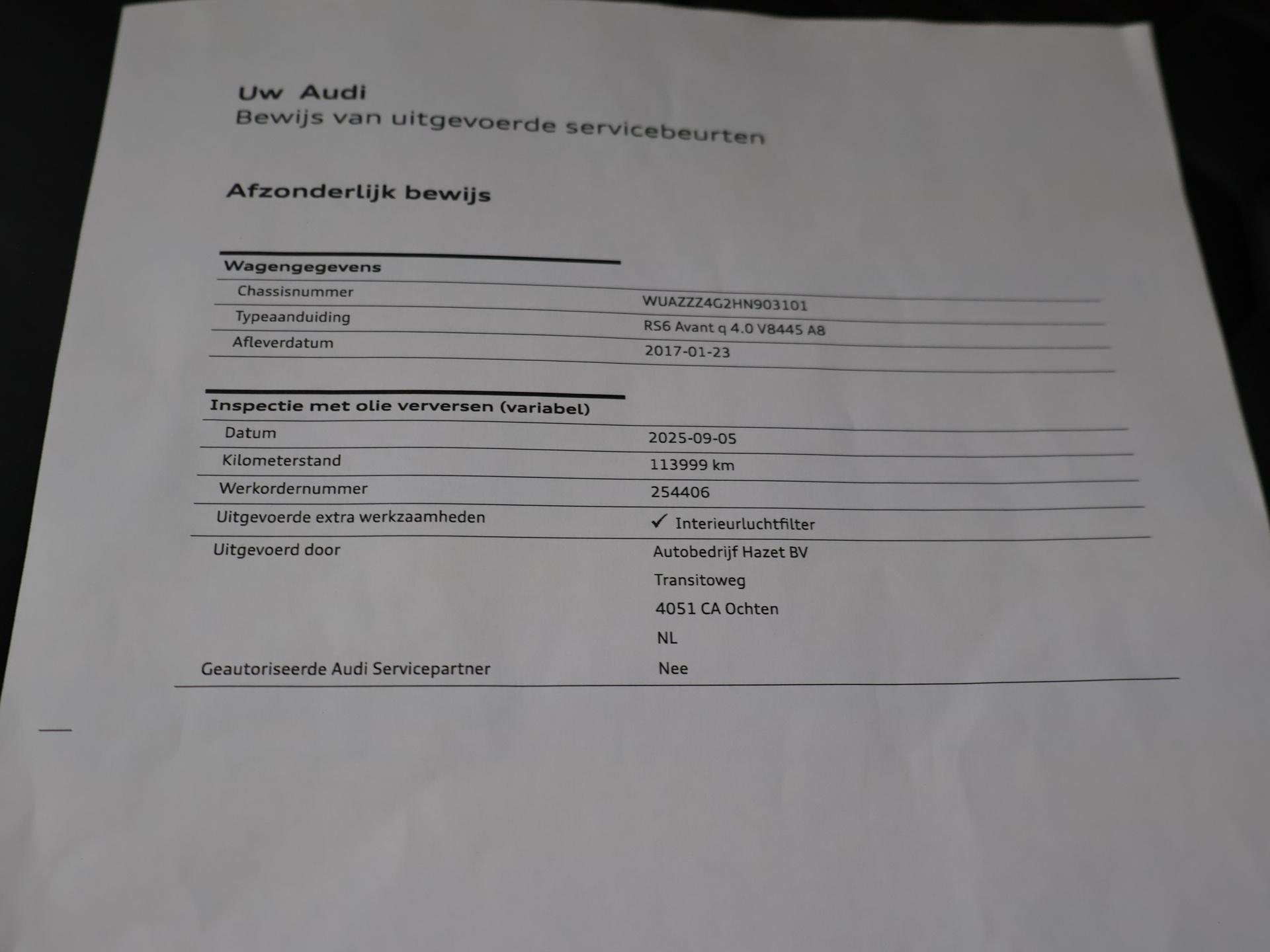 Audi RS6 4.0 TFSI V8 Bi-Turbo Performance met 605 PK vermogen en Quattro vierwielaandrijving, Audi Ceramic Brakes dus Keramische remmen, Audi Exlusive interieur met exclusive bi-color leder interieur + stoelen + middentunnel leder, Bang & Olufsen High End audio, Carbon interieur + exterieur styling, Carbon diffuser achterbumper, Carbon dashboard inleg, Carbon middentunnel, Privacy glass, 360 graden rondomzicht camera, Cruise control, 4-zone climate control, Zwarte alcantara hemelbekleding, LED koplampen, LED achterlichten, Elektrische achterklep, Keyless-entry en keyless-drive, Elektrische stoelverstelling met geheugen, Zwarte grille en logo's rondom, Achterspoiler, in 09-2025 bij 113.999 km nog onderhoud gehad. Meer informatieAlgemene informatieMerk: AudiModel: RS6 Type: 4.0 TFSI V8 605 PK PERFORMANCE + KERAMISCH | B&O Modelreeks: 2014 - 2018 Modelcode: C7 Technische informatieKoppel: 750 NmAandrijving: Vierwielaandrijving Tankinhoud: 75 liter Acceleratie (0-100): 3,7 s Topsnelheid: 250 km/u Maten en gewichtenLedig gewicht: 1.925 kgLaadvermogen: 655 kg Breedte: 194 cm Wielbasis: 291 cm MilieuCO₂-uitstoot (NEDC): 223 g/kmFijnstofuitstoot: 1,8 mg/km Financiële informatieMotorrijtuigenbelasting: € 360 - € 394 per kwartaalBeschikbare afleverpakketten:[list][*]Basispakket (inbegrepen):Vloeistofcheck Kenteken tenaamstelling Schoonmaken [*]Servicepakket 1 (€ 495 meerprijs): Olie servicebeurt incl. filter Schoonmaken Dit afleverpakket bevat (in plaats van afleverpakket "Basispakket"): Hazet garantie 3 maanden (3 maanden garantie); Nieuwe APK[*]Servicepakket 2 (€ 695 meerprijs): Onderhoudsbeurt volgens schema Schoonmaken Dit afleverpakket bevat (in plaats van afleverpakket "Basispakket"): Hazet garantie 6 maanden (6 maanden garantie, 10.000 km garantie); Nieuwe APK[*]Servicepakket 3 (€ 995 meerprijs): Onderhoudsbeurt volgens schema Poetsen, polijsten en interieur reiniging Dit afleverpakket bevat (in plaats van afleverpakket "Basispakket"): BOVAG garantie (12 maanden); Nieuwe APK[/list] ProductveiligheidEU verantwoordelijke: Audi AG Auto-Union-Straße 1 85057 Ingolstadt, NL 0800-28347378423 https://www.audi.de/de/ kundenbetreuung@audi.de |
