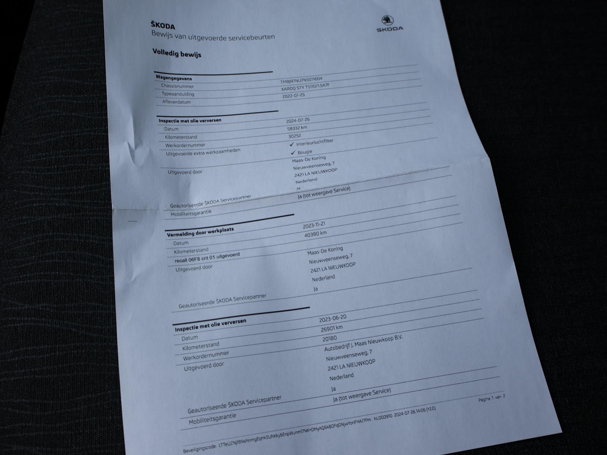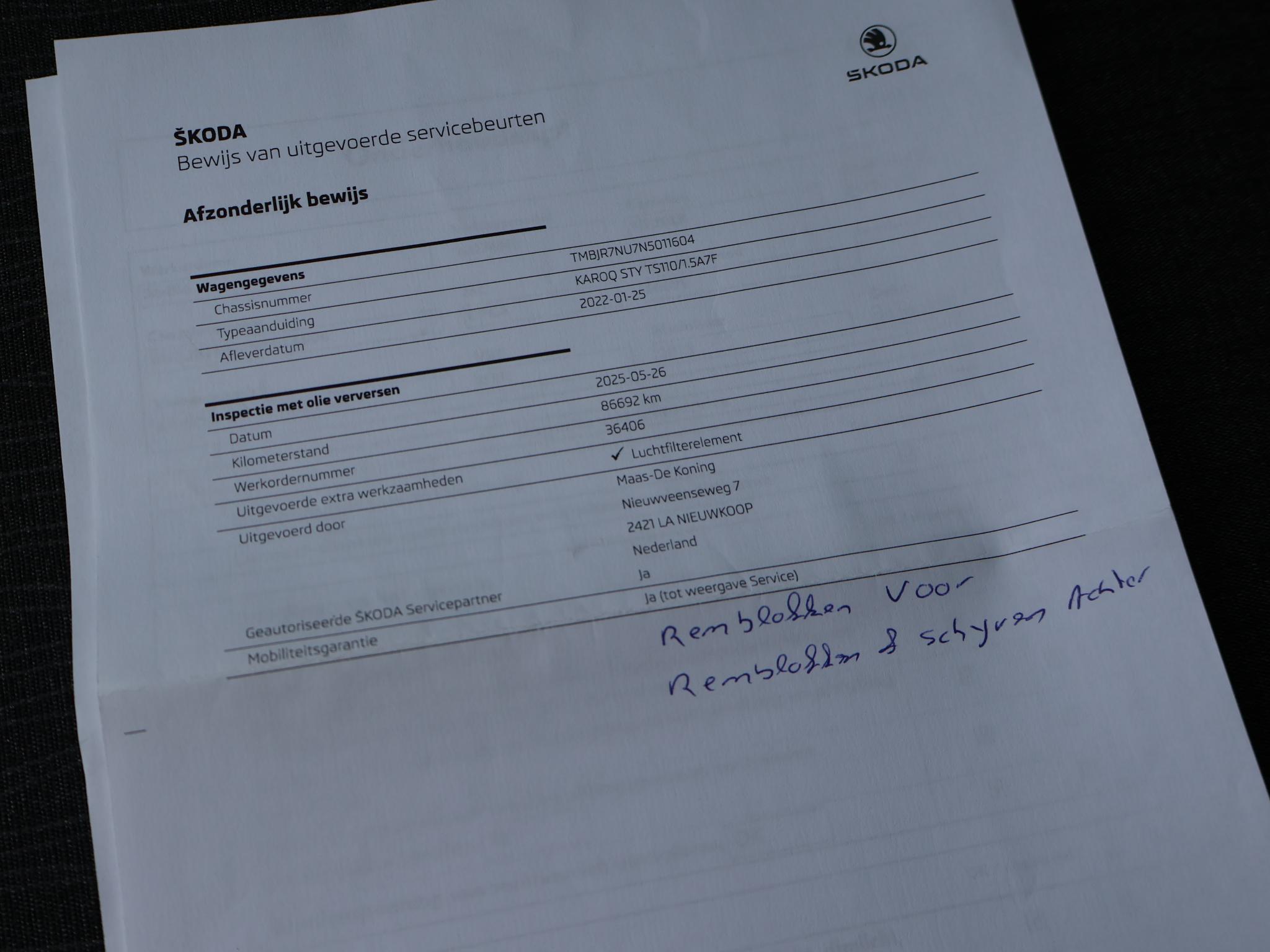 1.5 TSI 150 PK Automaat, Wegklapbare trekhaak, Canton premium audio, Adaptive cruise control, Achteruitrijcamera, Stoelverwarming, Apple Carplay / Android Auto appstreaming Google Maps, Flitsmeister, Whatsapp, Spotify, Elektrische voorruitverwarming, Climate control, DAB+ Digitale radio. Meer informatieAlgemene informatieMerk: SkodaModel: Karoq Type: 1.5 TSI ACT 150 PK AUT. + WEGKL. TREKHAAK | CANTON Modelreeks: 2018 - 2021 Technische informatieKoppel: 250 NmAandrijving: Voorwielaandrijving Tankinhoud: 50 liter Acceleratie (0-100): 9,0 s Topsnelheid: 203 km/u MatenAfmetingen (LxB): 438 x 184 cmWielbasis: 264 cm GewichtenLedig gewicht: 1.310 kgLaadvermogen: 620 kg Max. trekgewicht: 1.500 kg (ongeremd 700 kg) MilieuCO₂-uitstoot (WLTP): 144 g/kmFinanciële informatieMotorrijtuigenbelasting: € 199 - € 217 per kwartaalBeschikbare afleverpakketten:[list][*]Basispakket (inbegrepen):Vloeistofcheck Kenteken tenaamstelling Schoonmaken [*]Servicepakket 1 (€ 495 meerprijs): Olie servicebeurt incl. filter Schoonmaken Dit afleverpakket bevat (in plaats van afleverpakket "Basispakket"): Hazet garantie 3 maanden (3 maanden garantie); Nieuwe APK[*]Servicepakket 2 (€ 695 meerprijs): Onderhoudsbeurt volgens schema Schoonmaken Dit afleverpakket bevat (in plaats van afleverpakket "Basispakket"): Hazet garantie 6 maanden (6 maanden garantie, 10.000 km garantie); Nieuwe APK[*]Servicepakket 3 (€ 995 meerprijs): Onderhoudsbeurt volgens schema Poetsen, polijsten en interieur reiniging Dit afleverpakket bevat (in plaats van afleverpakket "Basispakket"): BOVAG garantie (12 maanden); Nieuwe APK[/list] ProductveiligheidEU verantwoordelijke: SKODA AUTO a.s. tr. Václava Klementa 869 29301 Mladá Boleslav, NL +420-236090002 https://www.skoda-auto.com/ infoline@skoda-auto.cz |